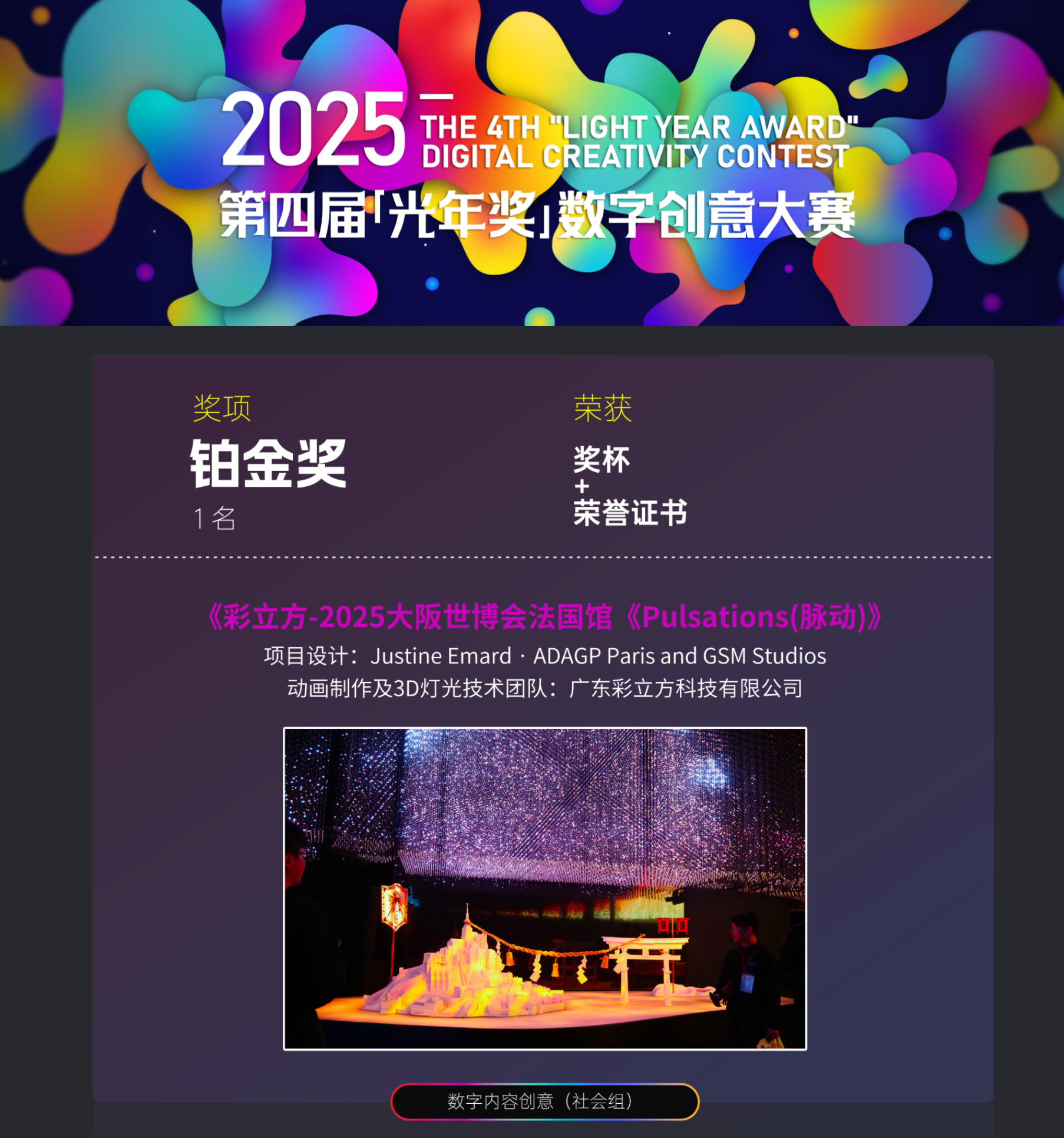 近日,我司参与的2025年大阪世博会法国馆《Pulsations》沉浸式空间项目,在第四届光年奖数字创意大赛中荣获“数字内容创意(社会组)铂金奖”。